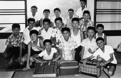 61年、小6の夏、修学旅行で日光へ。宿に着いたところで記念撮影。 いくら大部屋といっても17人も同部屋のはずがないから他の部屋の奴も来たのだろう。部屋にはラジオが付いていたのですぐにスイッチを入れたら、アルマ・コーガンの「ポケット・トランジスタ」が流れていた。 |