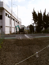 この脇、駅からイトーヨーカドーに沿って湾曲するように道が繋がっている跡がある。三菱製紙・ガス化学東京工場へ続く貨物の専用線が走っていた箇所で、まさしく廃線跡である。その他に金町駅からの貨物線として、砂町などを経由して(金町−新小岩の新金線)、越中島へ至る線(新小岩−越中島の越中島線)もある。こちらは現在も路線は残っており取材済みなので追って取り上げるが、幸いにも三菱専用線は線路が撤去されようとしている最中に写真に納めることが出来たのでご覧頂きたい。