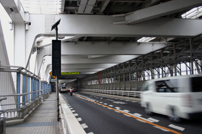 ビュービュー吹き荒れる海風を全身にモロに受け、しかも橋だから揺れるので真っ直ぐ立っていられない。トラスの隙間から見る湾岸の景色は高さをさらに助長させ、真横を通り過ぎる自動車の風と振動に煽られ、絶叫寸前。こ、怖ぇぇぇ!!!