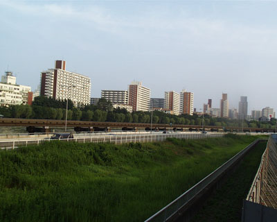 都営八潮団地は80〜83年に建設され、5268戸、総面積約40万8500平米。こりゃスゲェってなもんで入ってみると…個々の団地はスクエアに整列して配されておらず、趣向の違う高層マンションがテンデンバラバラに独立し、団地間もゆったりとしたスペースで緑地化がかなり進んでいて手入れも行き届いている。
