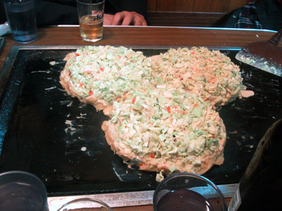 訪れたのは17時だったが、すでに店の前で客が待っている。ただし一組だけだったのでわりとすんなりと店内に入れた。店内は各4名がけの個室に分かれている。お好み焼きは結構高いが、ここは一つふんばって五味焼き1630円(!)を食べることにする。これは豚牛イカ海老タコが入ったもので、まあデラックスなお好み焼きというわけだ。ふだんは食べ物に関してはその値段にとてもうるさいのに、前日のづぼらやで値段に麻痺していたのと、憧れの菊水で舞い上がっていたせいか、なぜかこの値段に抵抗がなかったのだった。注文すると、お姉さんがきちんとセットされたお好み焼きのセットをもってきてくれる。残念ながら名物のご主人はもう亡くなっているので、今はその教えを継承した店のスタッフが焼いてくれるのだった。見ていると手際がとてもよく、美しく混ぜて、具を生地に美しく乗せて、美しく円形に仕上げて鉄板の上においた。「しばらくこのままで」といってお姉さんは姿を消す。焼けるのをじーっとみながらビールを飲む。この店、つまみとかまったく何もない。強いていうならお好み焼きがやける姿がつまみか(笑)。見ているとどんどん食べたくなってくるのだ。しばらくするとお姉さんがきてひっくり返す。ここでポイントは、ぺたぺたとコテでお好み焼きをたたかないことでしょうねえ。かくしてお好み焼きができあがり、青海苔などを各自でかけて食す。確かにウマイ。ビールを飲みながら待たされた分も混じってひたすらうまい。生地は焼きすぎでもなく、生焼けでもなくウマイ。タコやイカや肉関係の具もたっぷり自己主張していてウマイ。大きさもとても充分。満腹になってとても深い満足。なんというんですか、文通で憧れていた女の子に実際あってみると想像以上に美しい女の子だったって感じですかね。まあ思いが達成された満足感も強いですねえ。