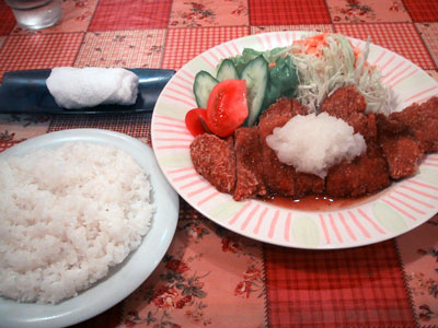 さて、ドアをあけると確かに入り口にケーキはあるものの、鰻の寝床のように長い店内にいる客は店内にある漫画などを読みつつ食事をとっている。私もボックス席に座って、「ウイークサイクルランチ」を注文。今日は「ポークカツの和風おろしソース」。これにサラダと飲み物もついているので夕食としてはまあまあの値段か。…と思っていたが、まもなくやってきた料理を見てびっくり。これが実に巨大なのだ。エマイユもすごいが、ここもなかなか負けていない。巨大なトンカツの上に大根おろしがどさりと載って、さらに野菜サラダもたっぷりと添えられている。さらにカツを食べてみると、サクサクとした衣と厚い肉がとてもスバラシイ。ご飯の炊き具合も絶妙。さらに珈琲などの飲み物もついているので、満足度が非常に高いといえますね。
