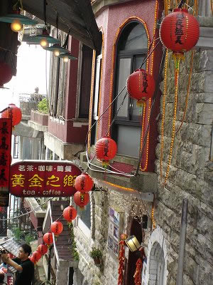 西口の駅前駐車場向かいのバス亭から基隆客運というバス会社のバスで「金瓜石」行きに乗る。九分バス亭まで20元。バスは乱暴な運転で非常に揺れる。なんと、つり革は固定されていないので自由自在に動く。この「自由自在」という思想が台湾というものをよく現しているとあとでわかるのだが。 乗客は乗るところも適当な感じでどこのバス亭に止まっているのかわからず、降りるところも当然不明。適当に皆がぞろぞろ降りるところで降りたら「旧道口」というところであったので、当初の予定とは逆から九分をめぐることになる。